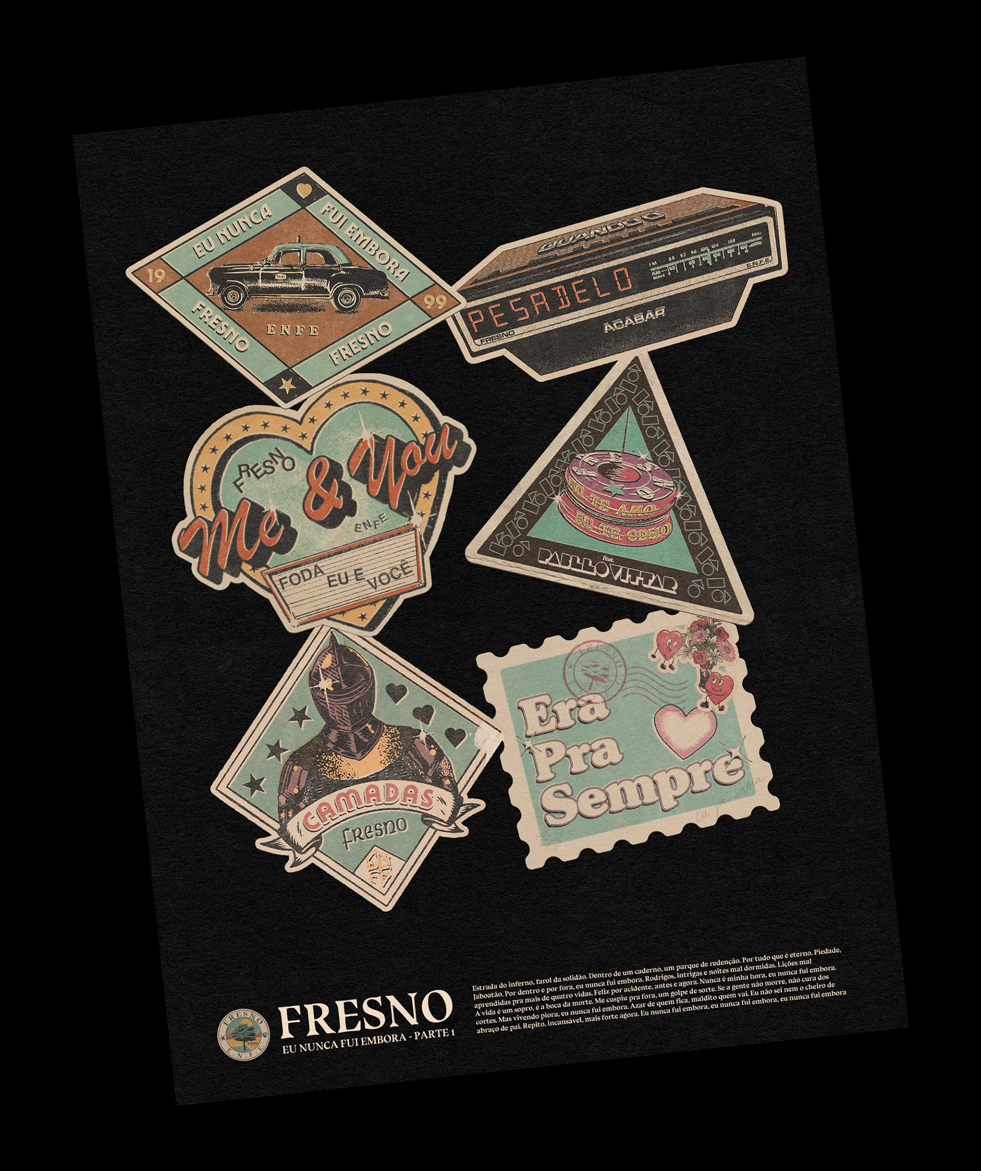 Para o lançamento da primeira parte do novo álbum da Fresno, criei uma ilustração, uma espécie de selo para cada uma das músicas, inspirado em elementos das letras das músicas, curiosidades e todas seguindo a nova identidade visual da banda.