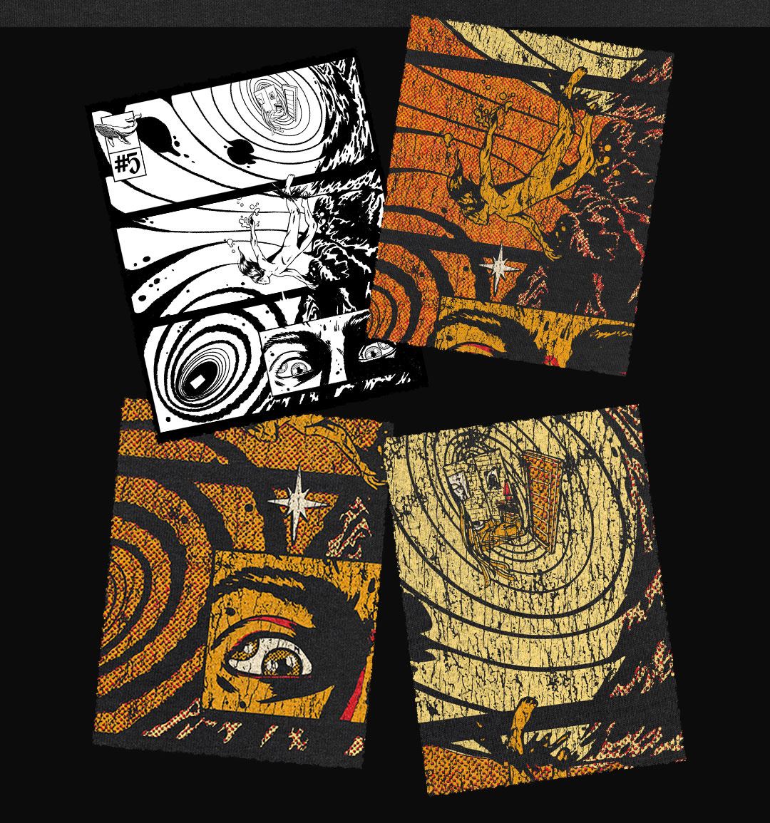 A estampa ilustra a trajetória de uma personagem transpassando cada universo dos singles previamente lançados, sendo a concepção e composição feitas pelo @thms_pbl e as cores e finalização por @ruhtraldi.